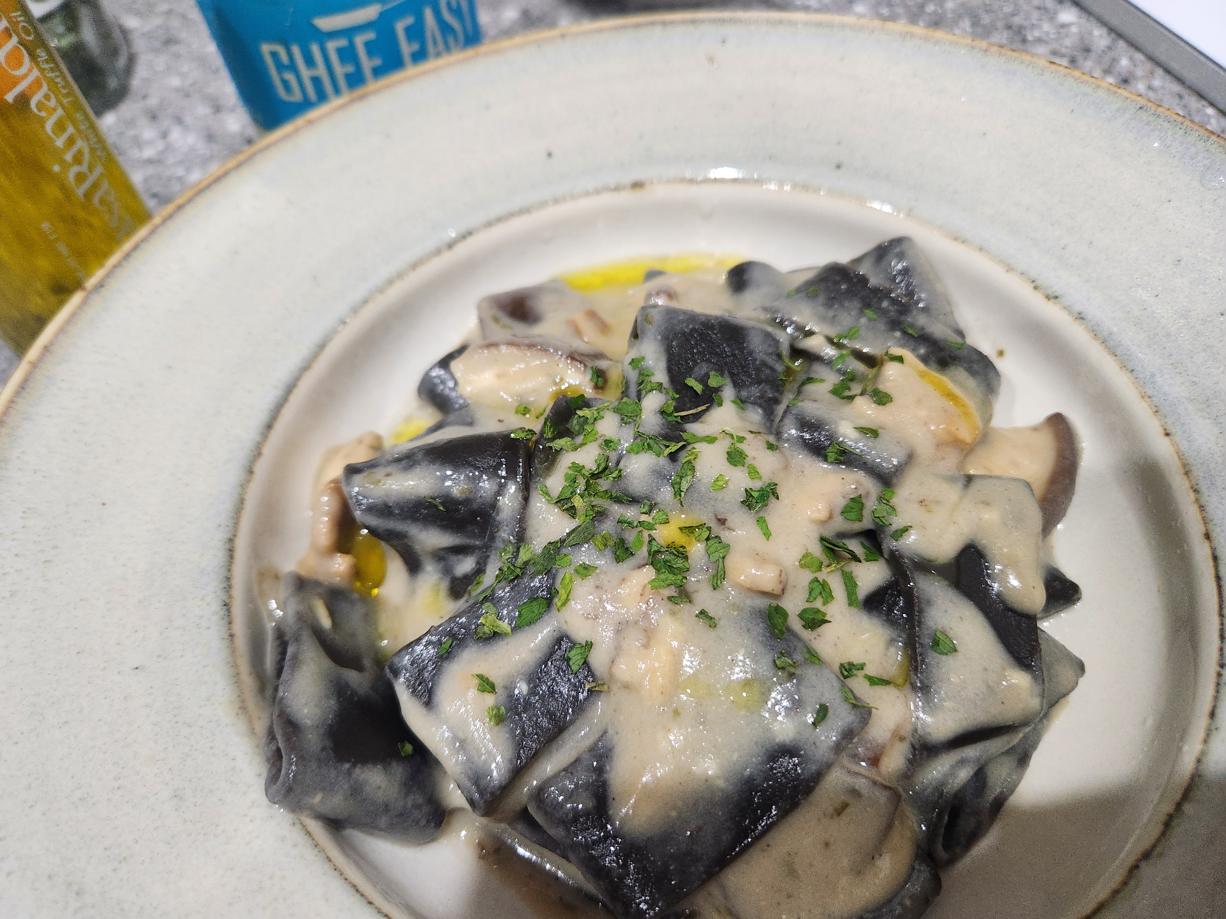 선물받은 칼라마라타 제품이 있어서 만들어본 오징어 먹물 파케리 포르치니 파스타입니다.