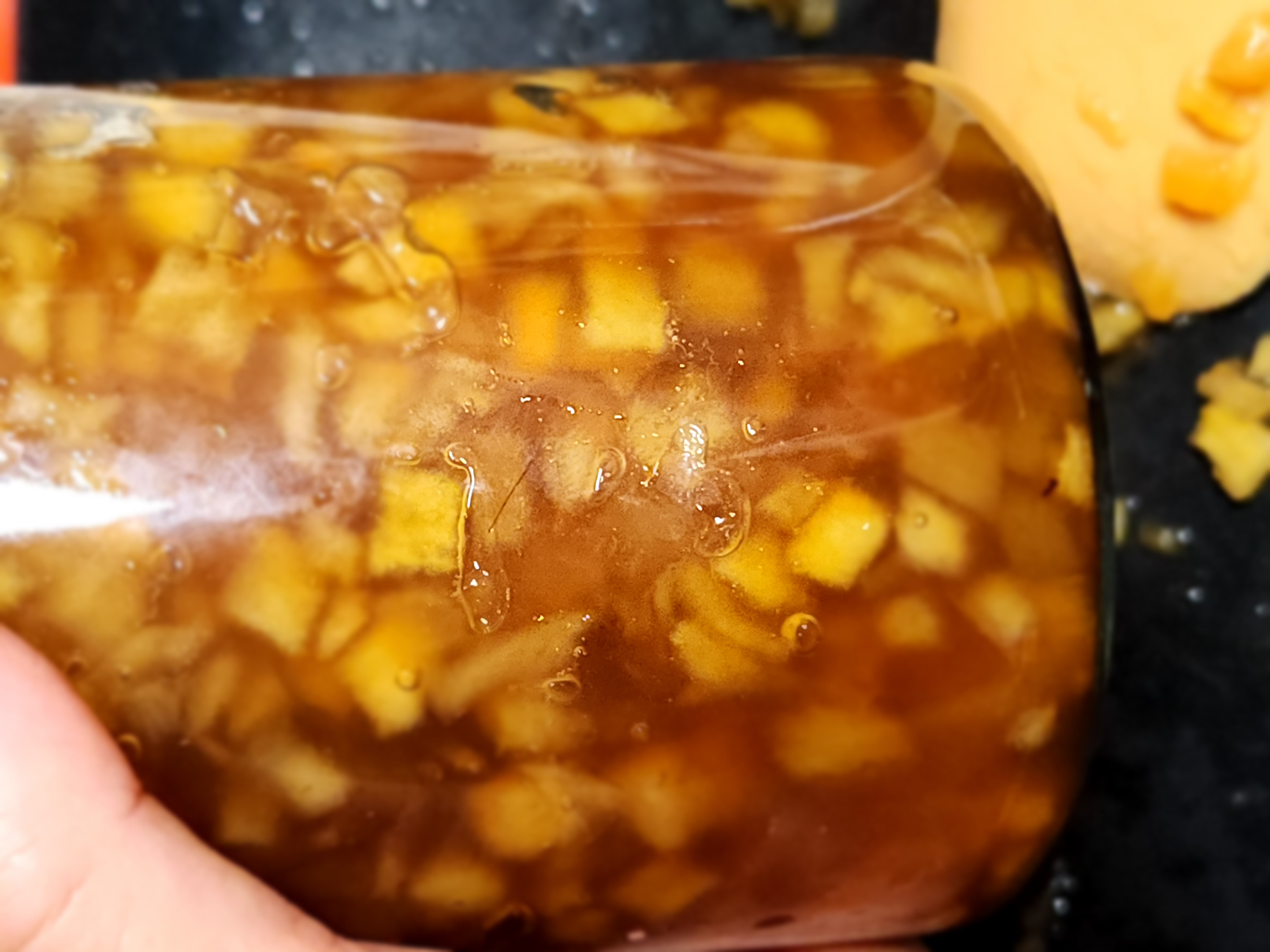 - 손질한 사과에 오미자 청을 넣고 잘 섞어준다. 이 상태로 약 30분~1시간 정도 두면 사과에서 자연스럽게 수분이 나오기 시작한다. 이 과정은 콩포트를 만들 때 과일이 타는 것을 방지하고 자연스럽게 오미자청이 사과에 스며들게된다.