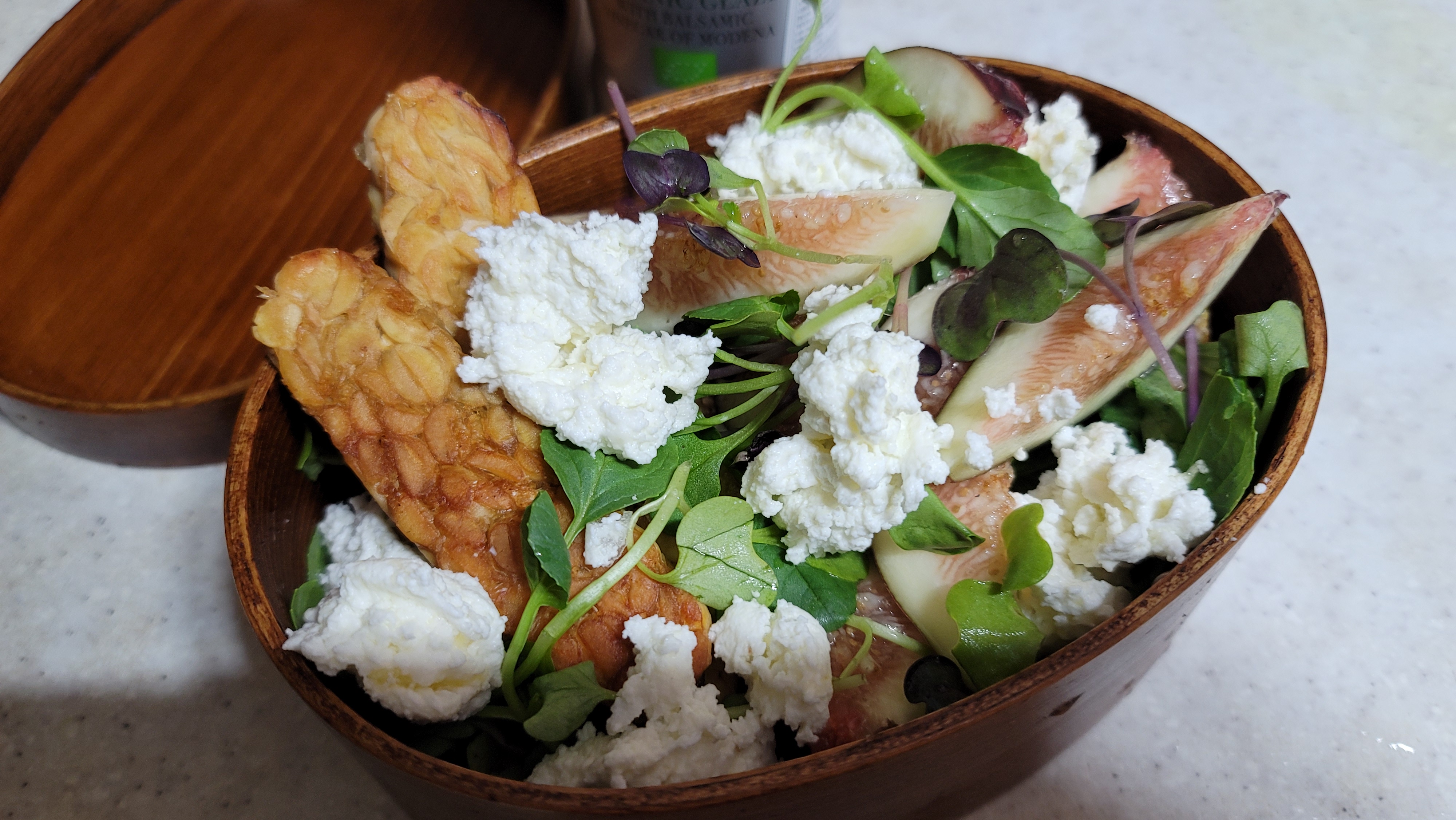 3. 그릇에 템페, 어린잎, 무화과, 리코타 치즈를 올려준다.