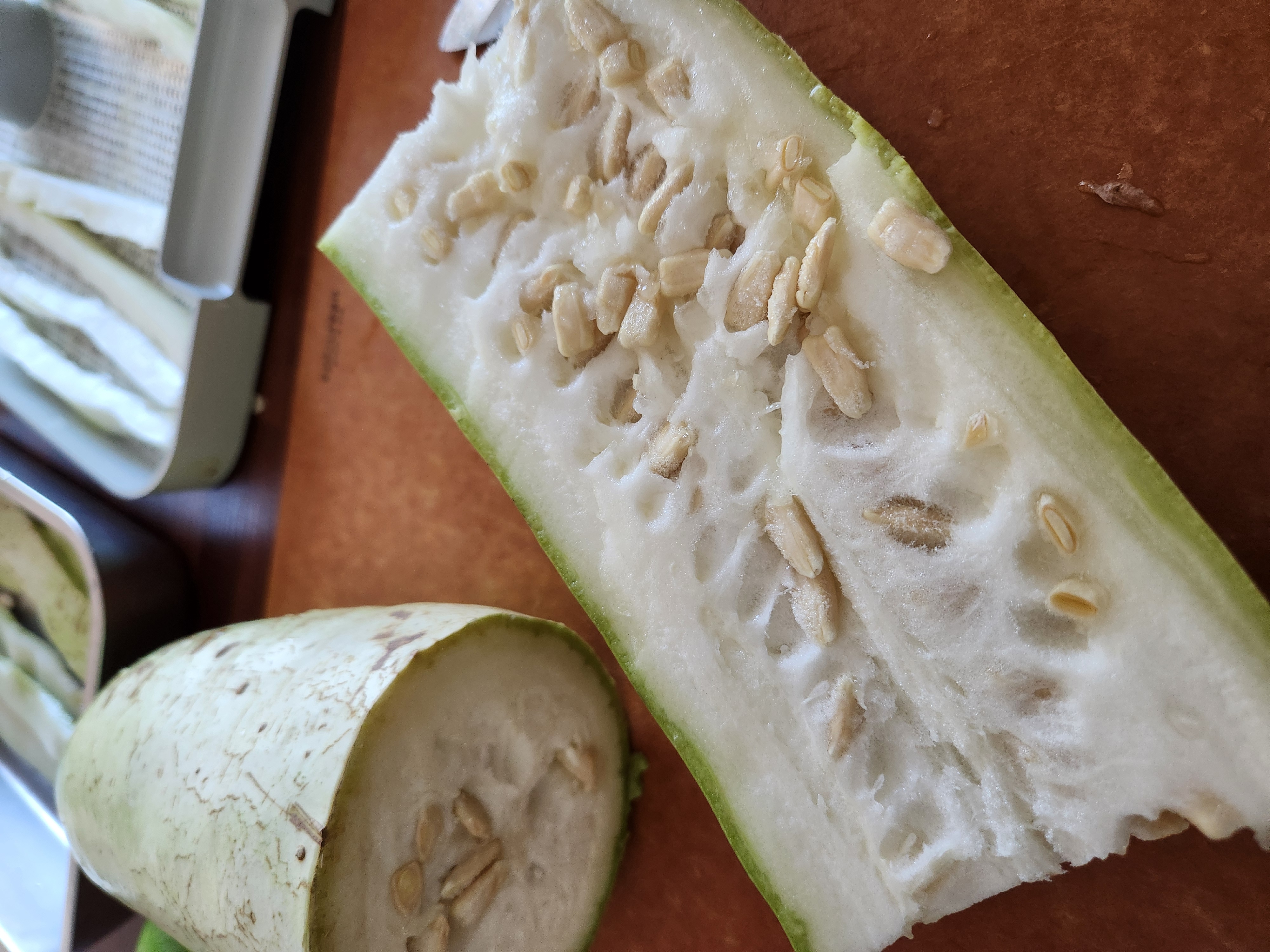 뜨거운 태양 볕 아래 잘 영글어진 뭉뚝하고 노랗다 못해 진하게 노쇠해진 모양 바로 노각입니다. 일정하지 않은 흰 줄은 오이가 늙어가기를 기다린 시간을 말해주듯 견고하고 껍질은 단단하기까지 합니다. 하나를 툭 따 시원한 물에 씻어서 필러로 껍질을 까봅니다. 칼로 반을 가르면 참외만큼 씨앗이 가득합니다.