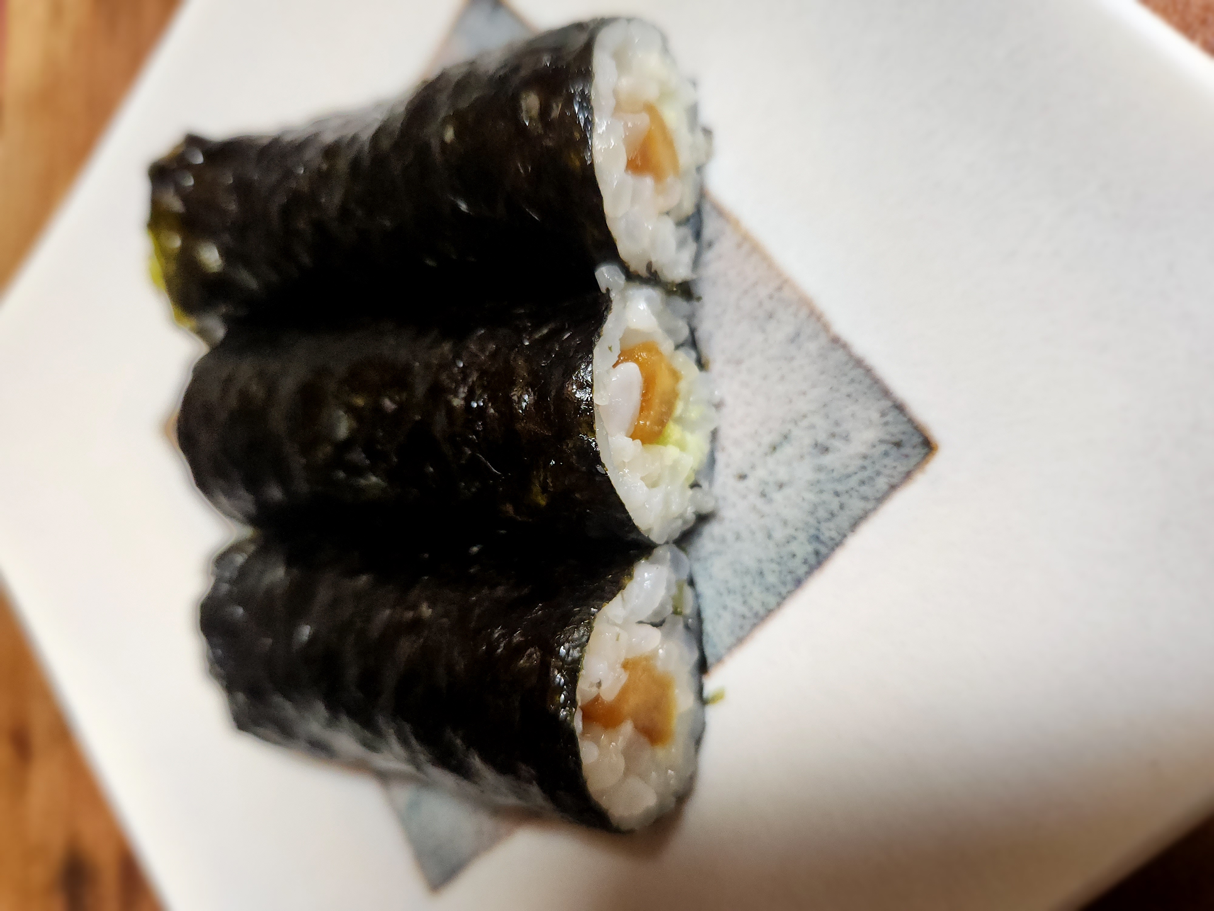 박고지김밥, 간뾰마끼(干瓢巻き)는 일본에서 유래한 전통적인 김밥 종류로, 말린 박을 사용한 간단한 초밥 말이인데요. 일본어로 ‘간뾰(干瓢, かんぴょう)’는 말린 박을 뜻하며, 이 간뾰를 간장에 절이고 양념하여 만든 속재료를 김에 밥을 돌돌 말아 만드는 김밥을 간뾰마끼라고 합니다. 일식집에서 흔히 접할 수 있는데 박을 말려서 조리한 거라 꼬들꼬들한 식감도 재미있답니다.