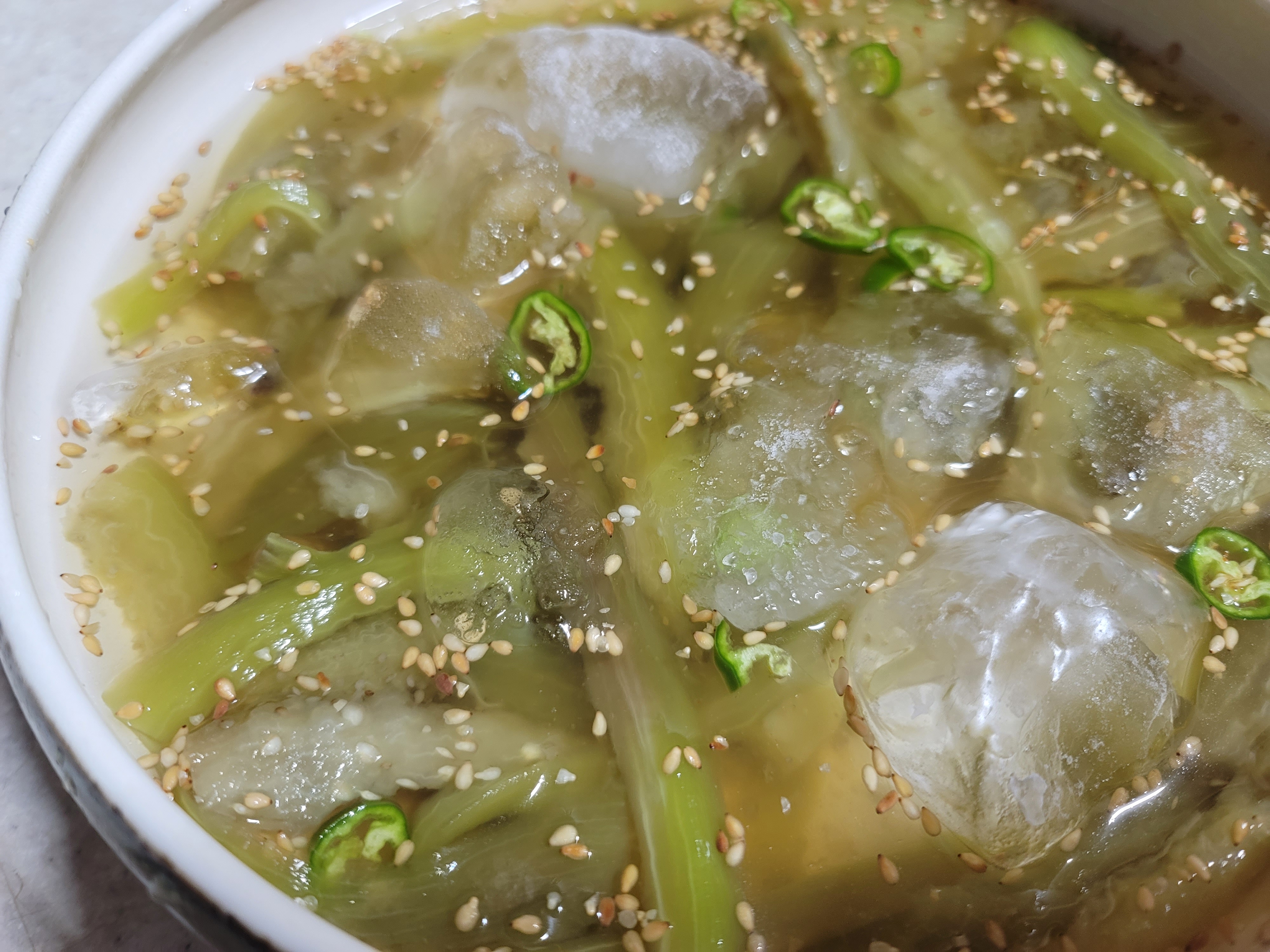8. 식탁에 올리기 직전에 들기름 1큰술과 통깨 1큰술, 얼음 15개 내외를 넣어줍니다.