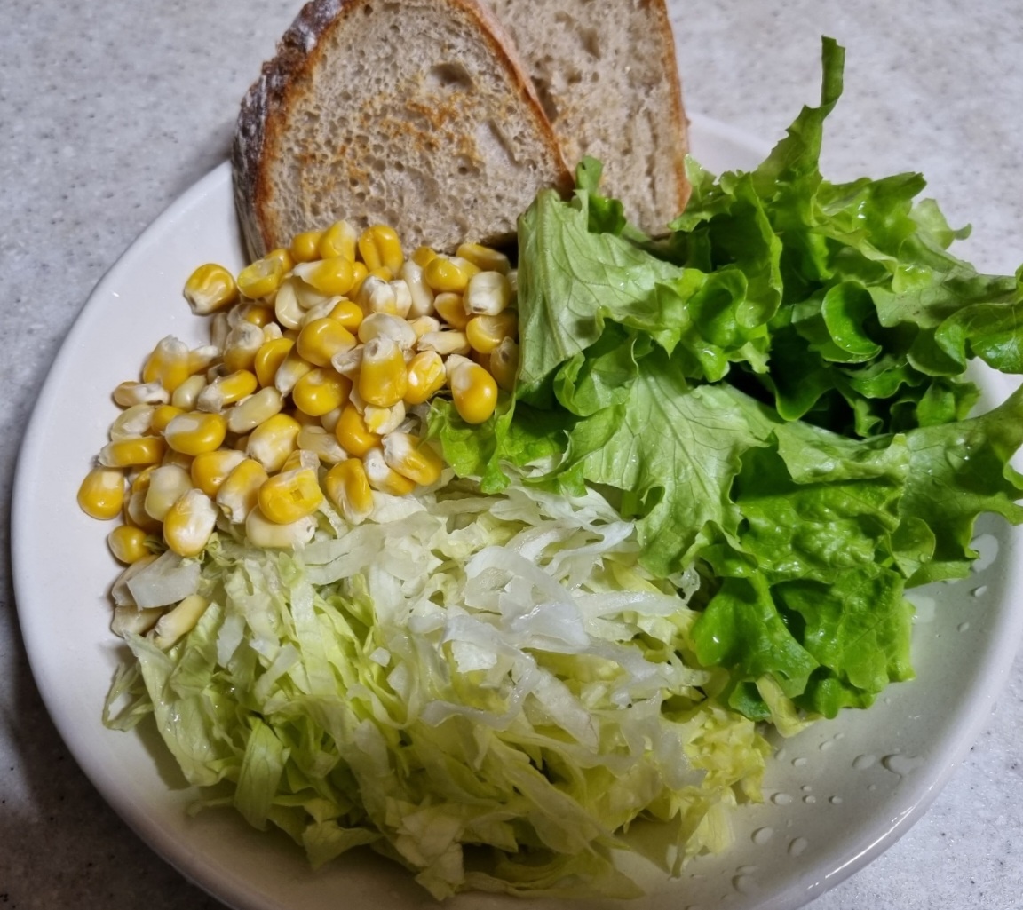 5. 접시에 채를 썰어둔 유기농 양상추와 이자벨레튜스, 초당 옥수수알을 담습니다.