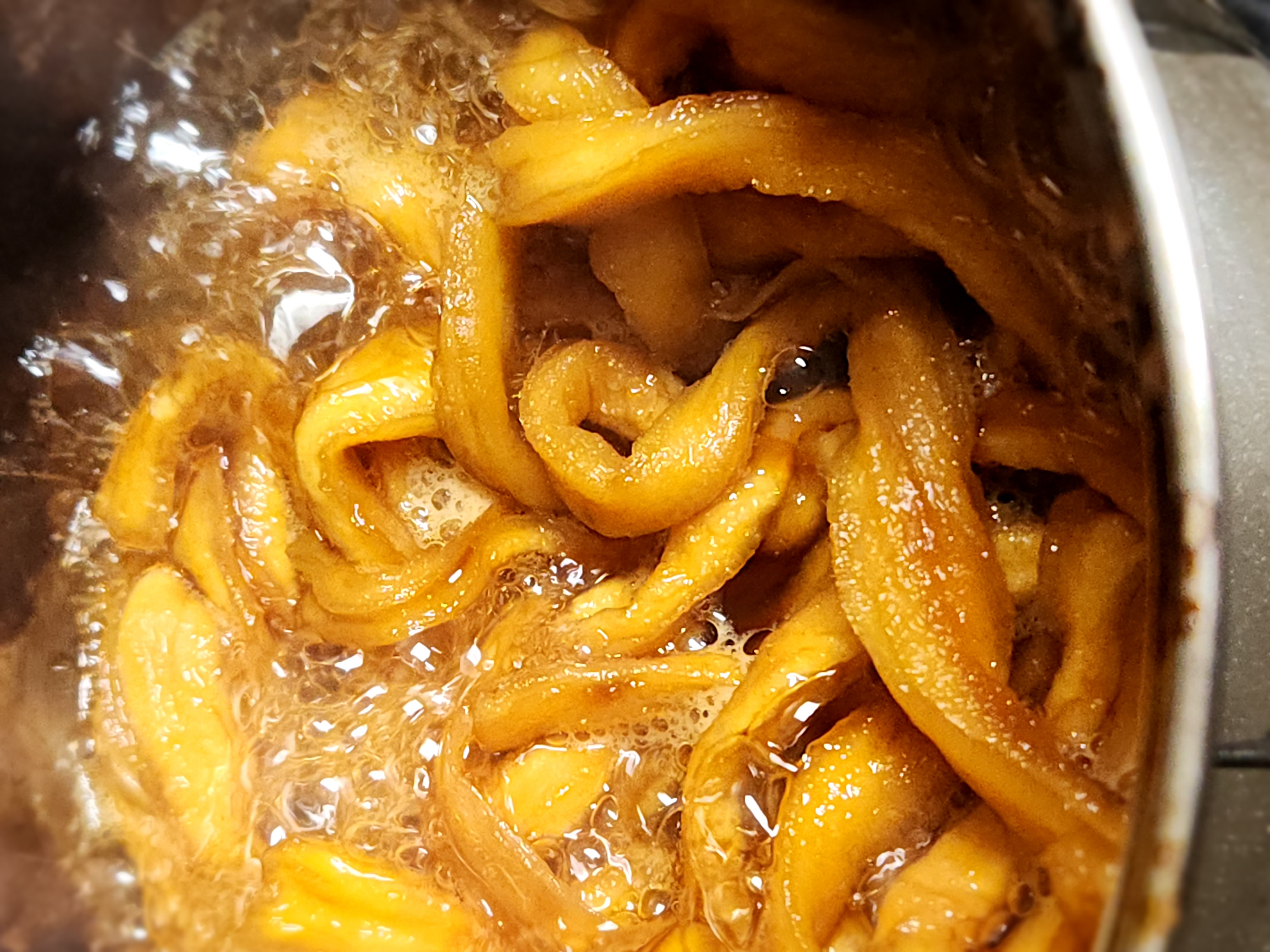 - 냄비에 우리콩간장, 비정제설탕, 미림을 넣고 박고지(간뾰)를 졸여 간이 잘 배도록 한다.