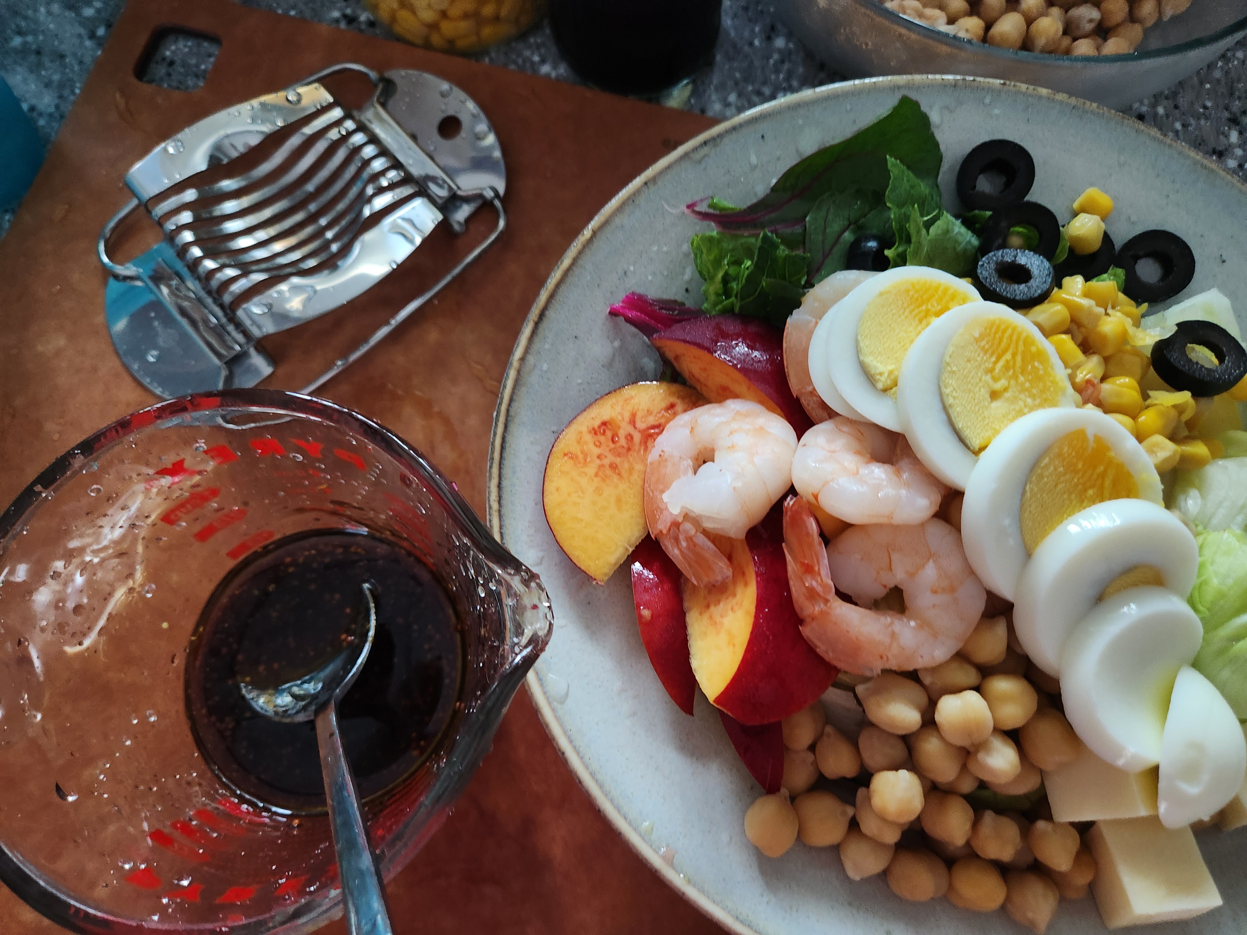 3. 토핑 및 추가: 삶은 달걀, 데친 새우, 삶은 병아리콩, 옥수수콘, 파인애플절임, 치즈 등을 토핑해주고 추가 토핑을 원한다면 샐러드 위에 고루 올린다.