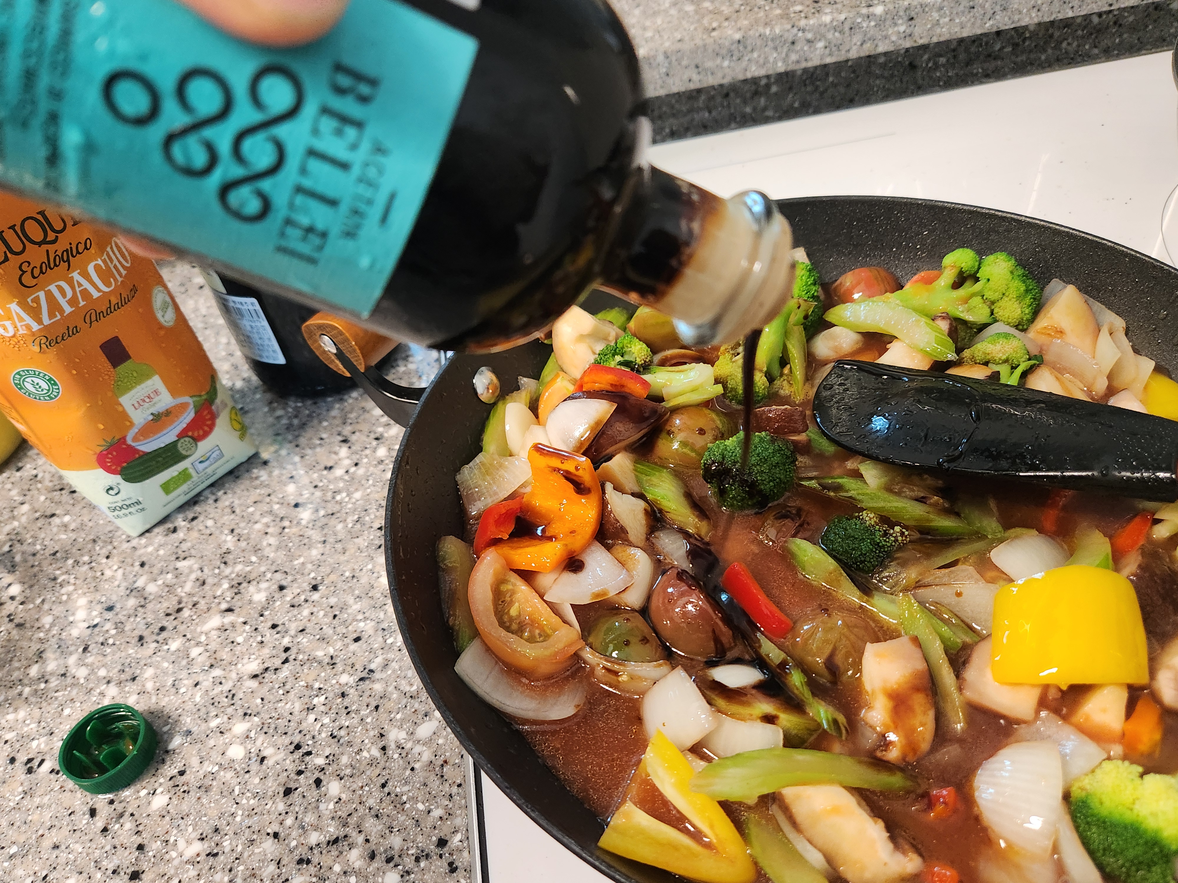 5. 고기를 구워내어 한쪽에 담아두고 그 팬에 3번 손질된 편마늘과 양파 순으로 야채들을 넣고 기버터를 넣어 볶다가 가스파초, 발사믹식초, 와인, 간장, 소금을 넣고 끓여준다. 기호에 따라 간은 가감한다.